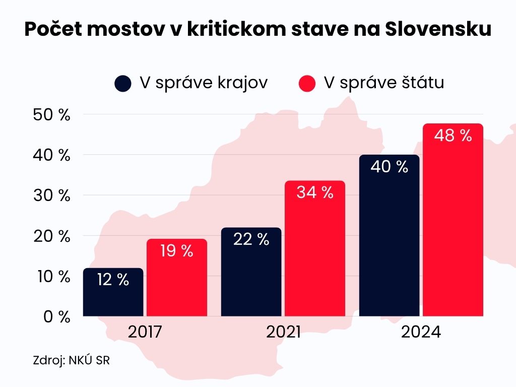 Situácia sa na Slovensku zhoršuje dlhodobo, upozorňuje NKÚ. Kým v roku 2017 bolo v najhorších stupňoch iba 12 percent župných mostov, v roku 2020 sa ich počet zvýšil na 22 percent a do roku 2024 na spomínaných takmer 40 percent.